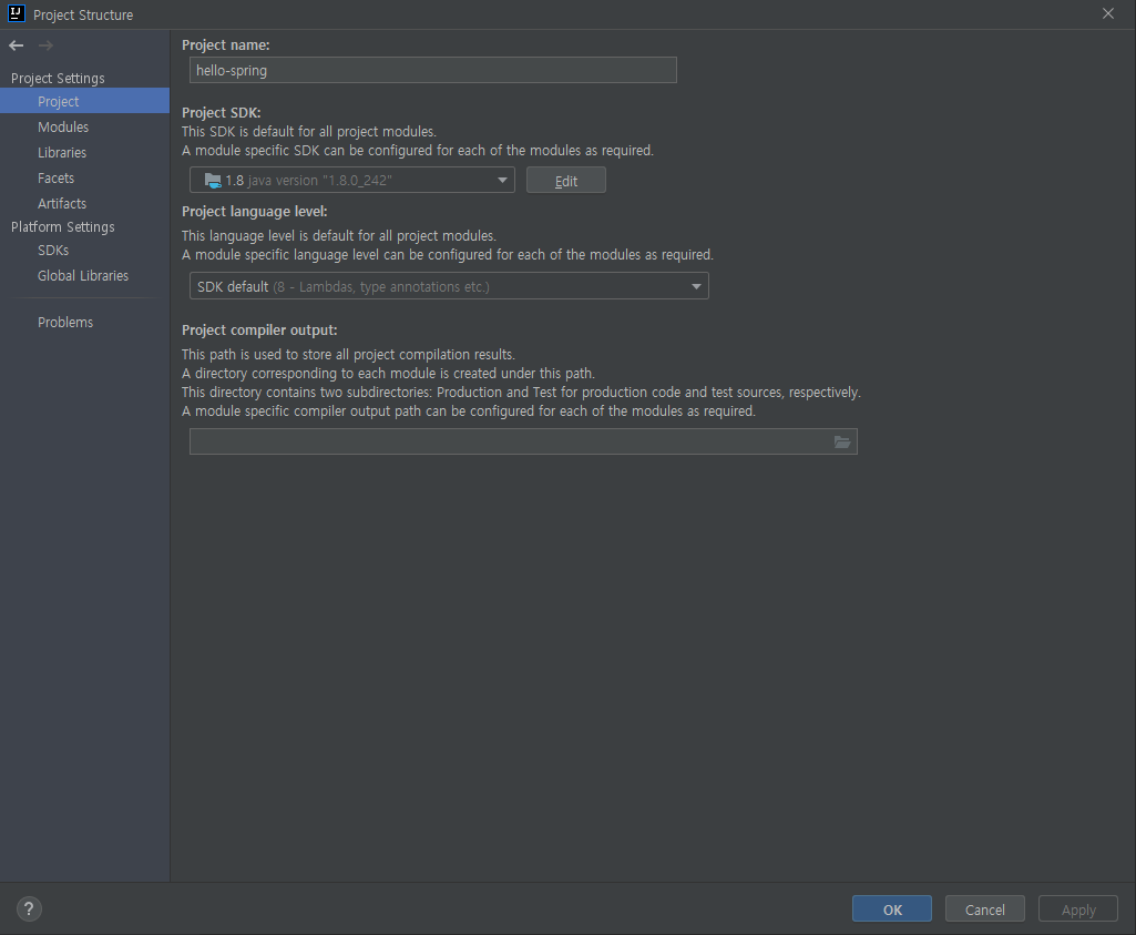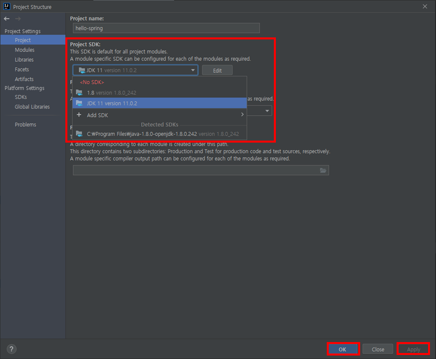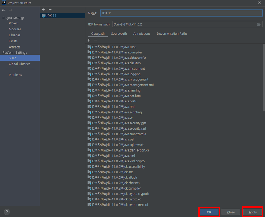 프로젝트 버전에 맞는 JDK를 설정해줍니다.