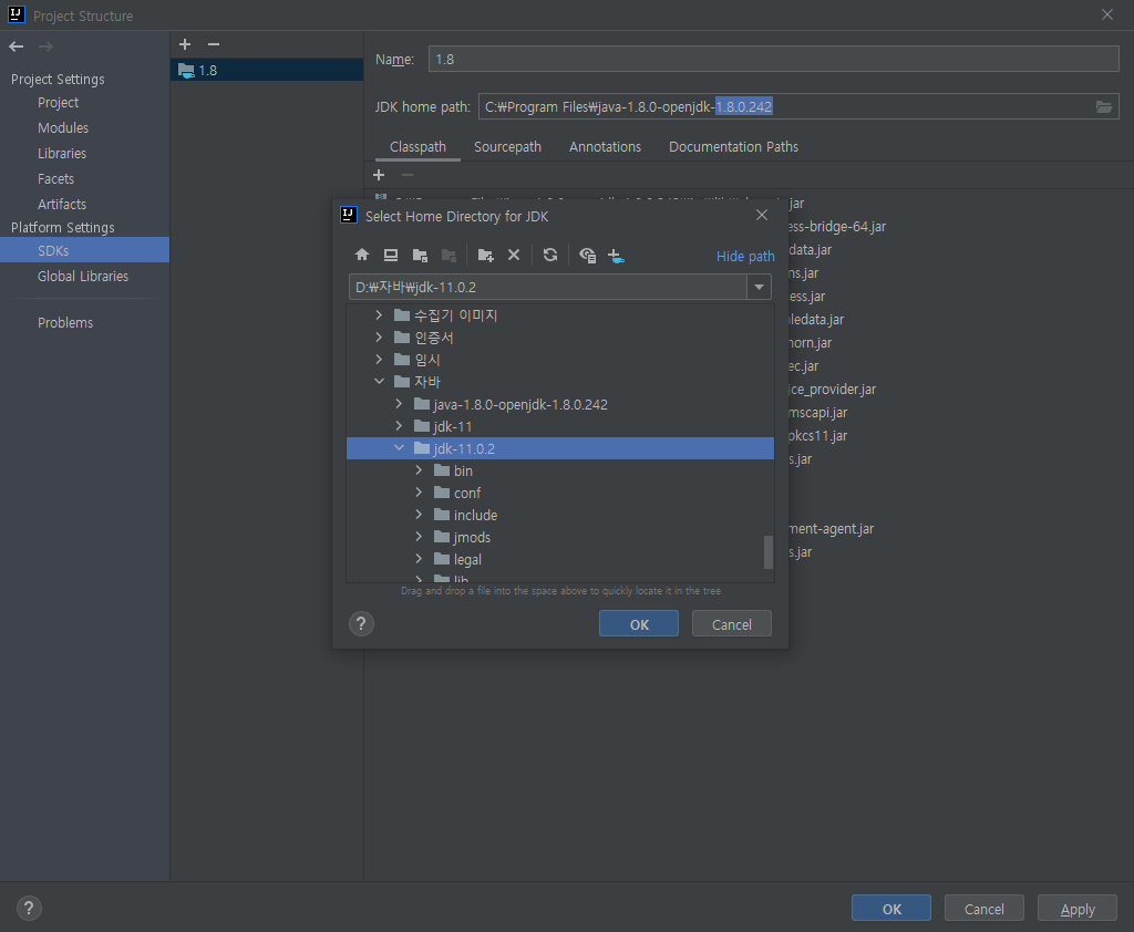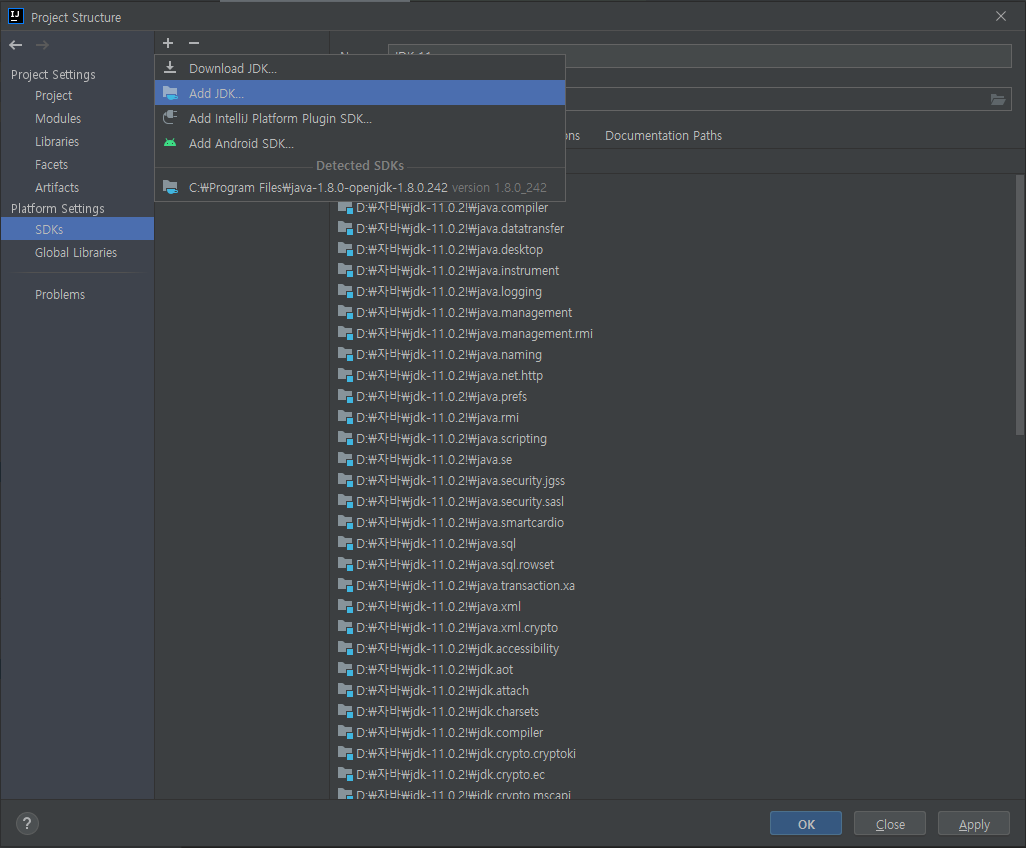 - 해당 프로젝트에 맞는 자바 버전을 설치 후 추가합니다. 이미 설치되어있는 경우 추가하지 않아도 됩니다.
