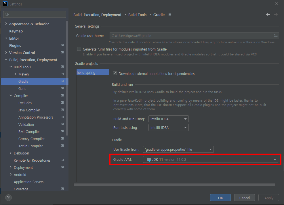 Gradle 버전에 맞는 JVM을 설정해줍니다.