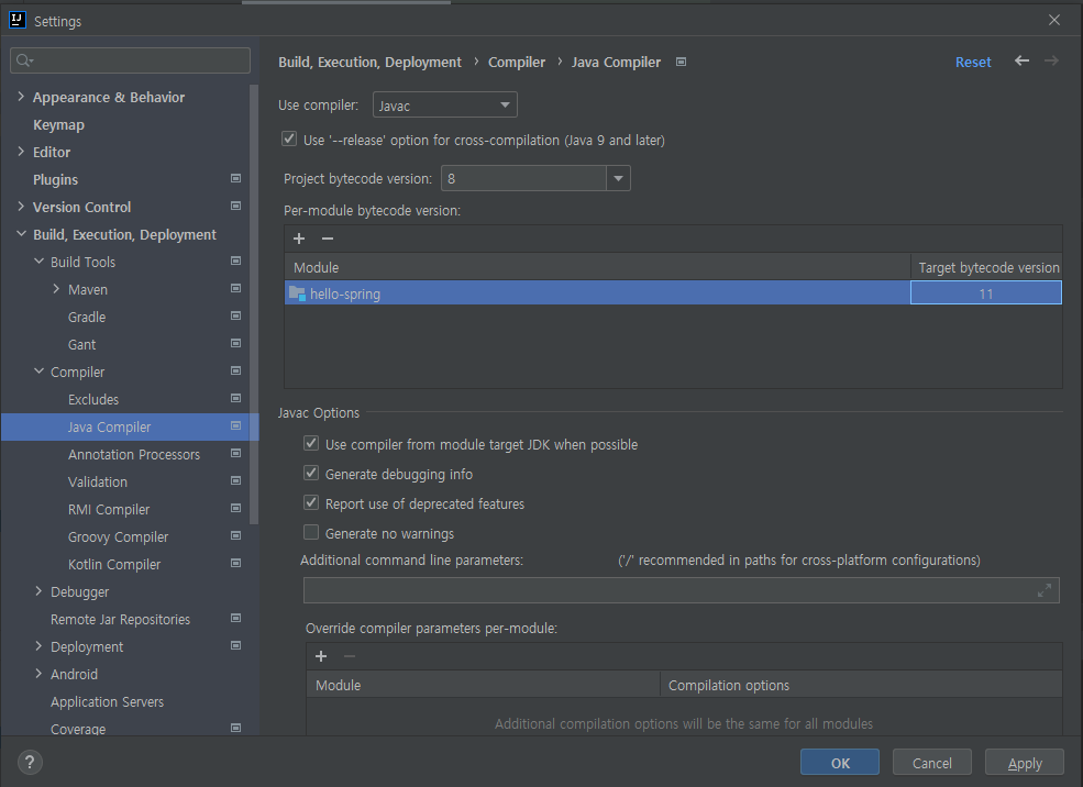 모듈 별로 자바 컴파일러를 설정했을 경우 버전이 맞는지 확인 후 설정합니다.