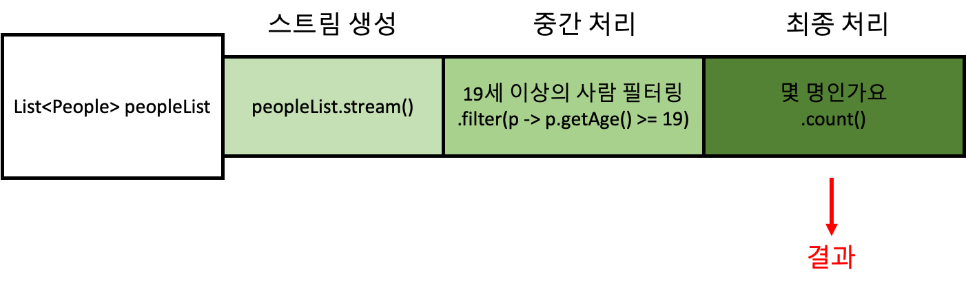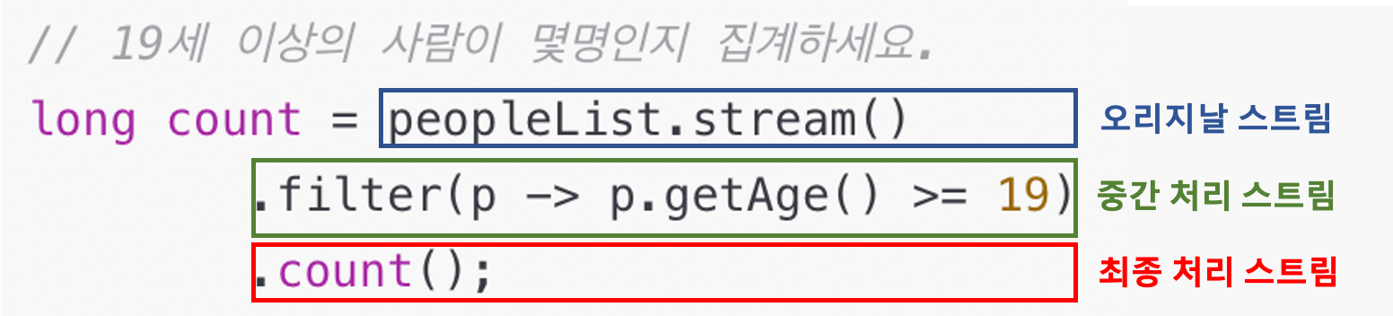 EX) List<People> 컬렉션에서 19세 이상의 사람이 몇 명인지 집계하세요.