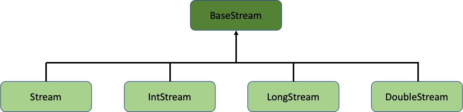 - BaseStream 인터페이스를 부모로 해서 실제로 사용하는 자식 인터페이스들이 상속 관계를 이루고 있습니다.
