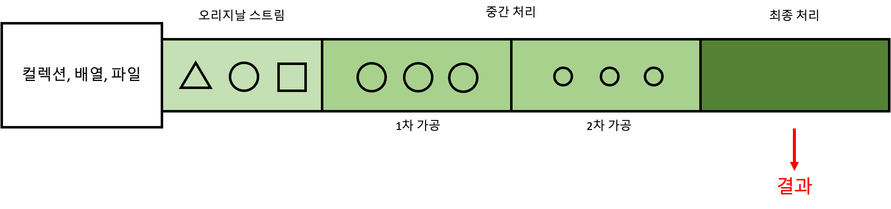 - 중간 처리(매핑, 필터링, 정렬 등)는 여러 번 사용할 수 있습니다.