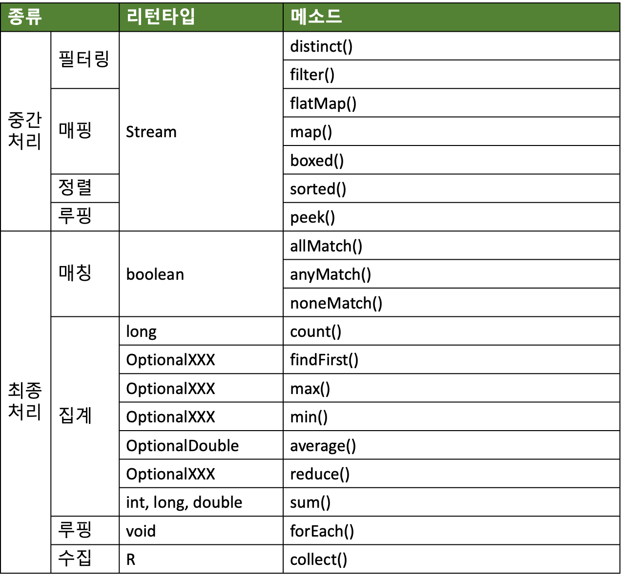 - Stream API의 대표적인 메소드입니다. 기본형 Stream 메소드는 생략했습니다.