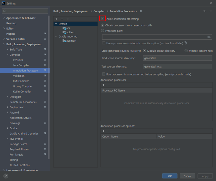 - File > Settings(preference) > Build, Execution, Deployment > Compiler > Annotation Processors