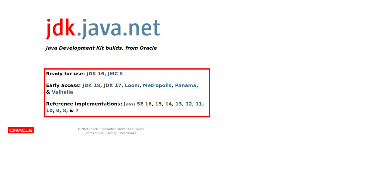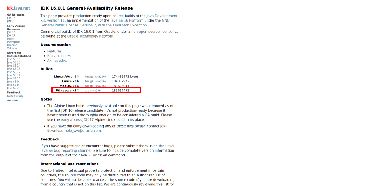 - 사이트에 접속하면 다음과 같은 화면이 나타납니다. 원하는 버전 링크를 클릭합니다. (필자는 JDK 16 선택)