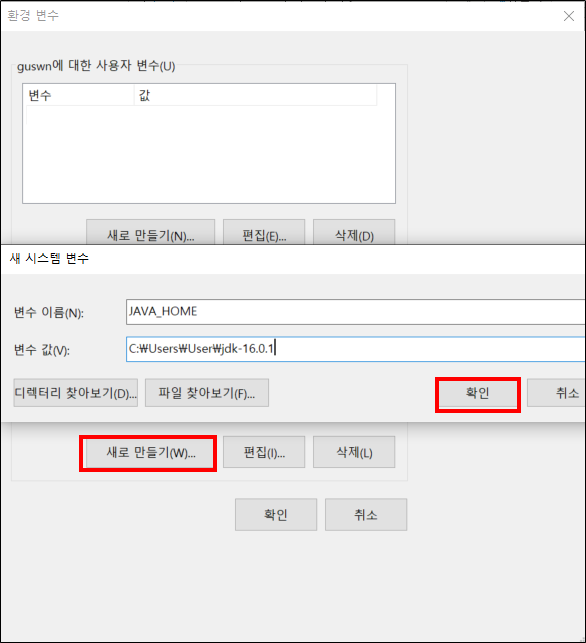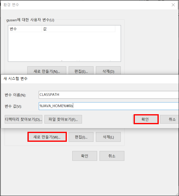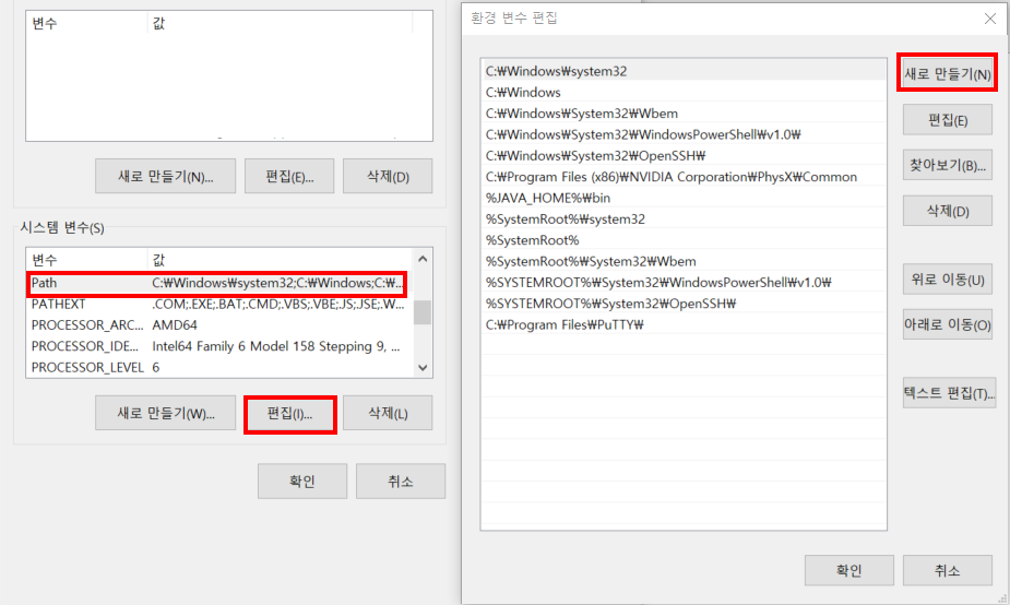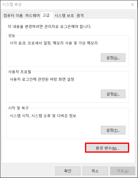 - 환경 변수를 클릭해 시스템 변수를 설정합니다.