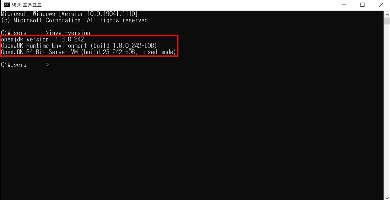 - 명령 프롬프트를 실행 후 java -version을 입력합니다.