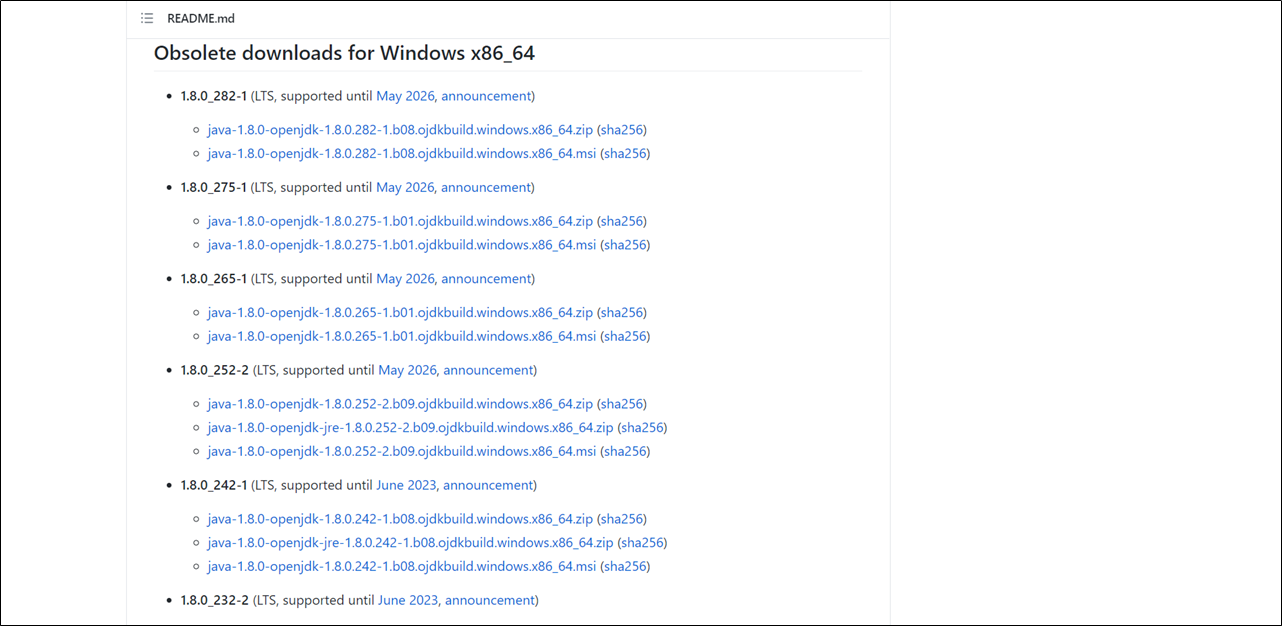 - 사이트에 접속하면 다음과 같은 화면이 나타납니다. 아래로 스크롤을 하면 Windows를 위한 OpenJdk 파일들이 나옵니다. 원하는 버전의 JDK.zip 또는 JDK.msi 파일을 설치합니다. (필자는 java-1.8.0를 설치했습니다.)